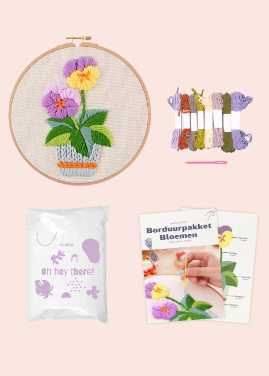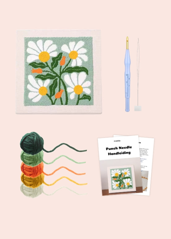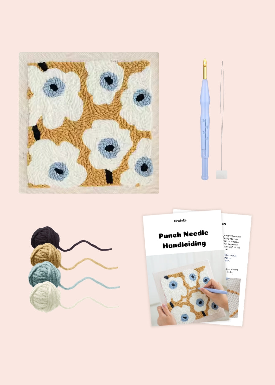 Wil je liever video-uitleg van de steken? Op ons YouTube kanaal vind je video’s van alle borduursteken en een duidelijke tutorial over punch needle, inclusief uitleg over het inrijgen van de naald en hoe je begint met punchen. Klik hier om naar ons YouTube kanaal te gaan.