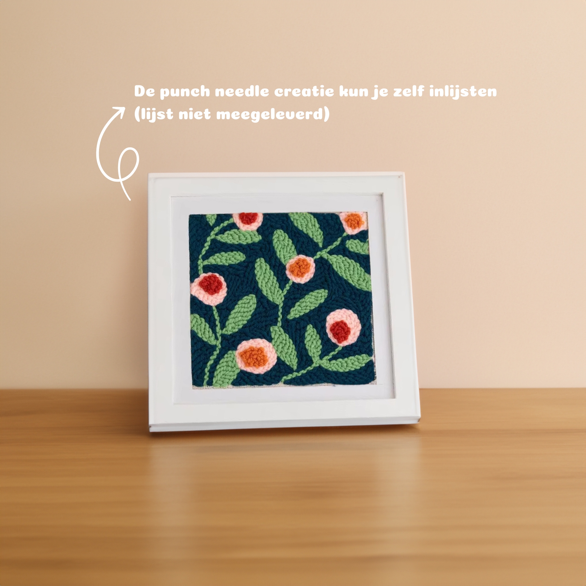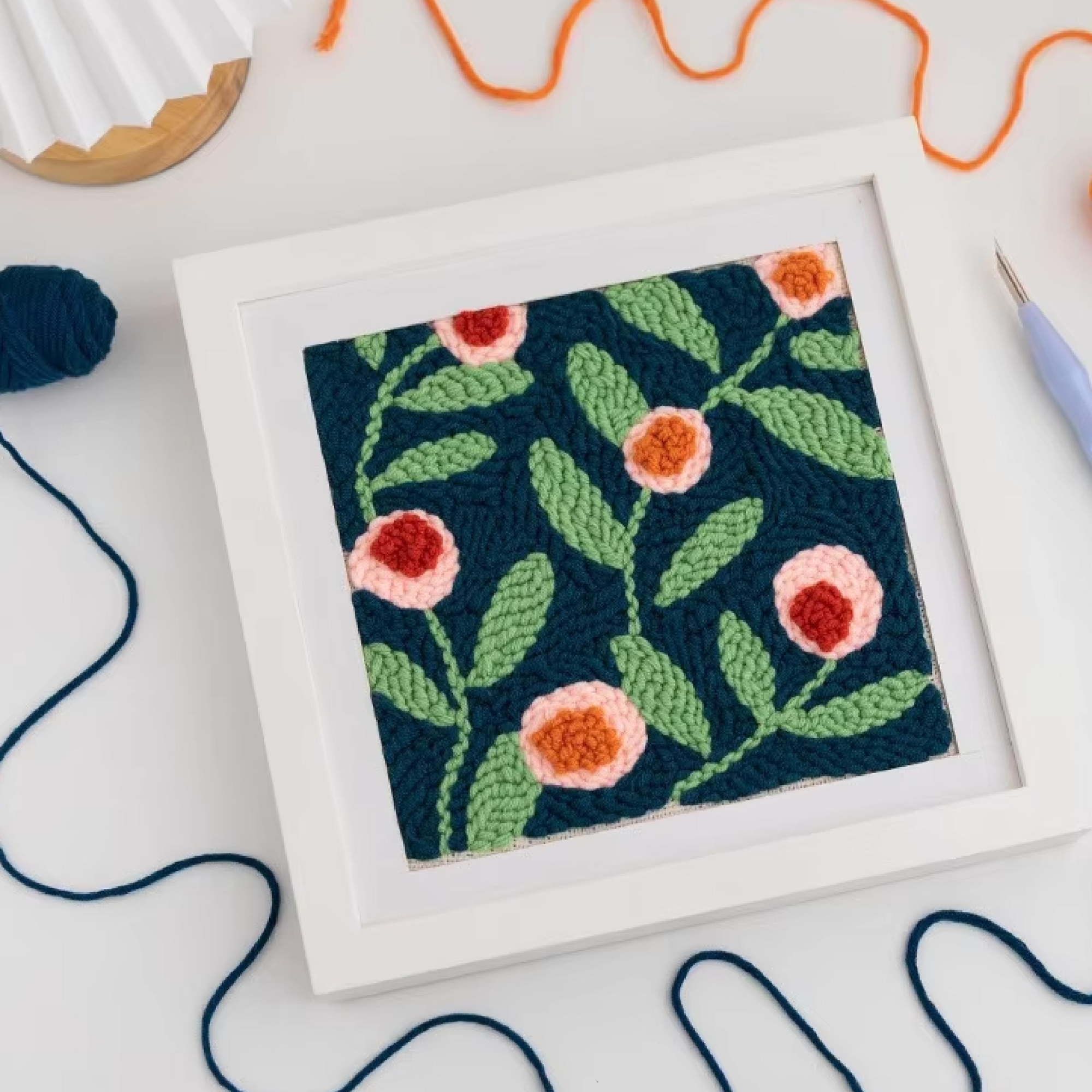 Punch needle pakket met een Nederlandse handleiding. Alles wat je nodig hebt zit in dit pakket, je kunt dus direct thuis aan de slag met het borduurpakket. Inclusief punch naald, draadinrijger, 5 kleuren garen en een canvas doek.